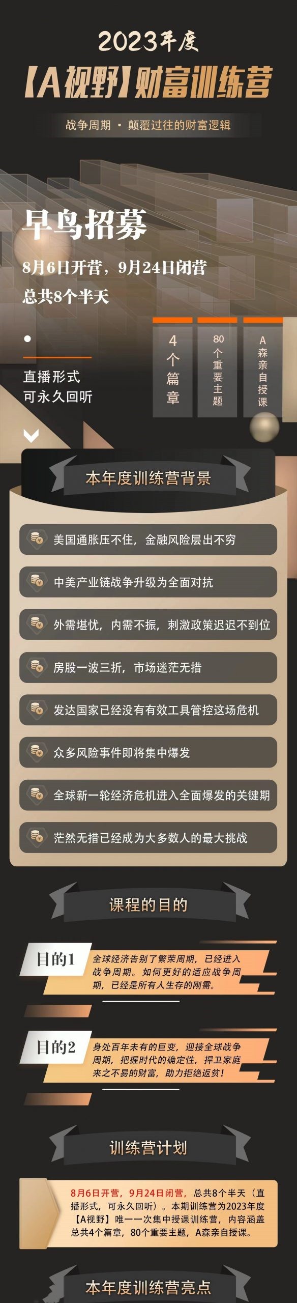 8月6日开营,9月24日闭营,总共8个半天。本期训练营为2023年度【A视野】唯一一次集中授课训练营,内容涵盖总共4个篇章,80个重要主题,A森亲自授课。