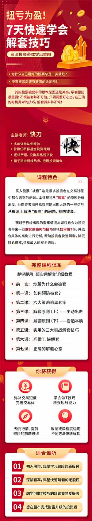 而对于已经出现的套牢情况本课程也会为投资者带来一些解套的策略与技巧包括如何做T等,并结合具体的案例进行分析,帮助投资者快速解套,降低持仓成本,寻找最大的安全边际。