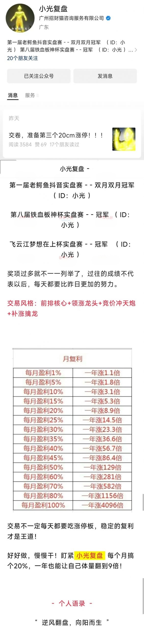 操作风格:公众号人气大V,交易风格:前排核心+领涨龙头+竞价冲天炮+补涨擒龙