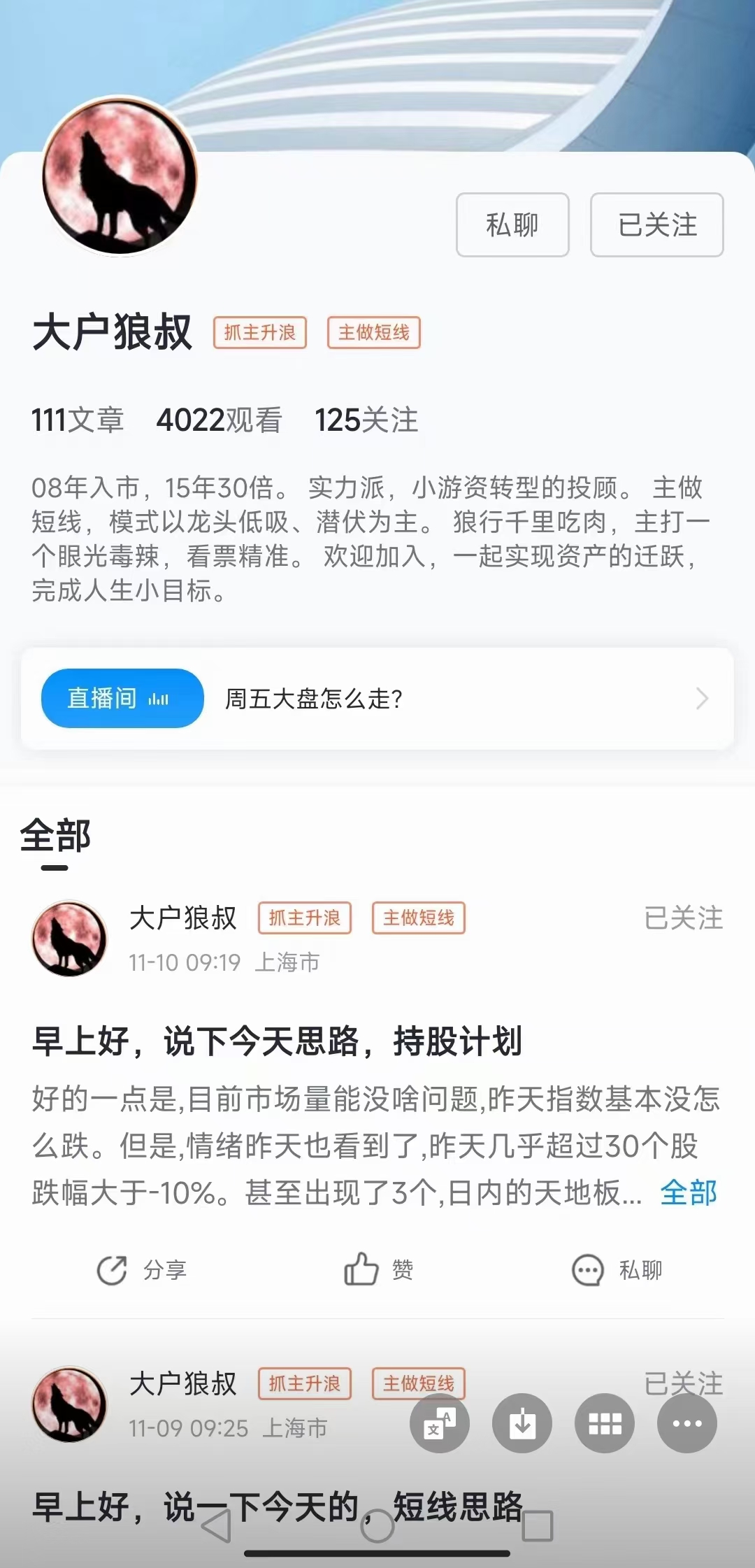08入年市,15年30倍。力实派,小游资转型投的顾。 主短做线,模式以龙头低吸、潜伏为主。 狼千行里吃肉,主打一个眼光毒辣,票看精准。