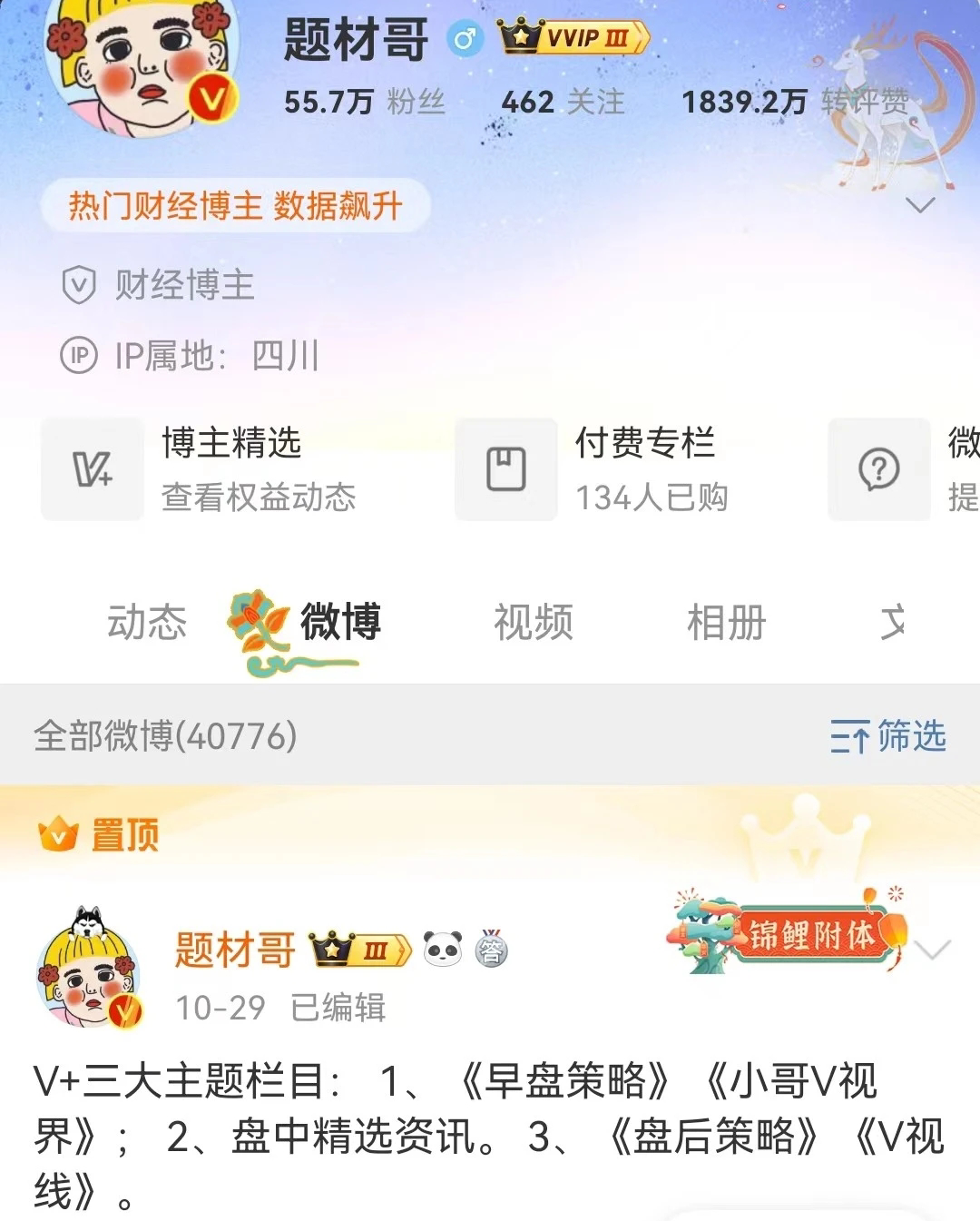 【实时同步】题材哥 微博55.7w粉丝,每日阅读数100w+,付费小圈子功能性大V