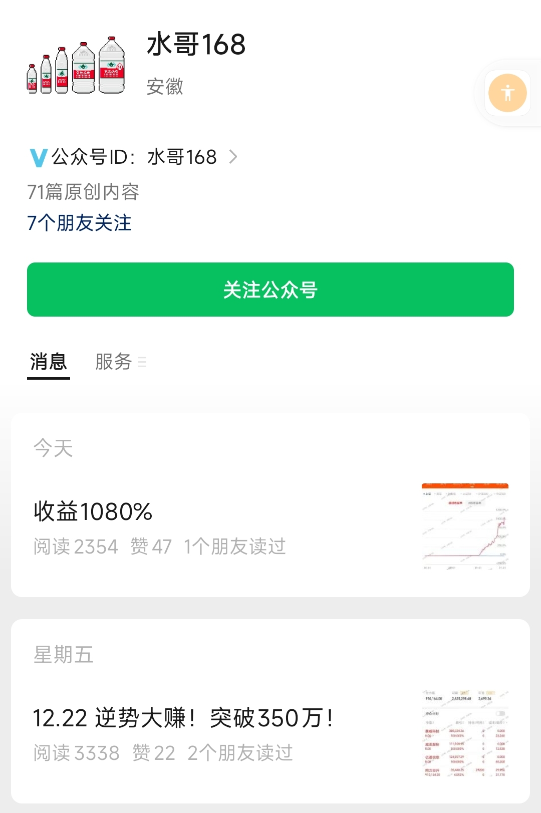 公众号同名大V,实盘比赛选手,连续大肉被客户推荐,三十万做到八十多万,每一笔操作都有记录,每天的计划需要打赏66一次,目前反馈比较好,胜率百分百。
