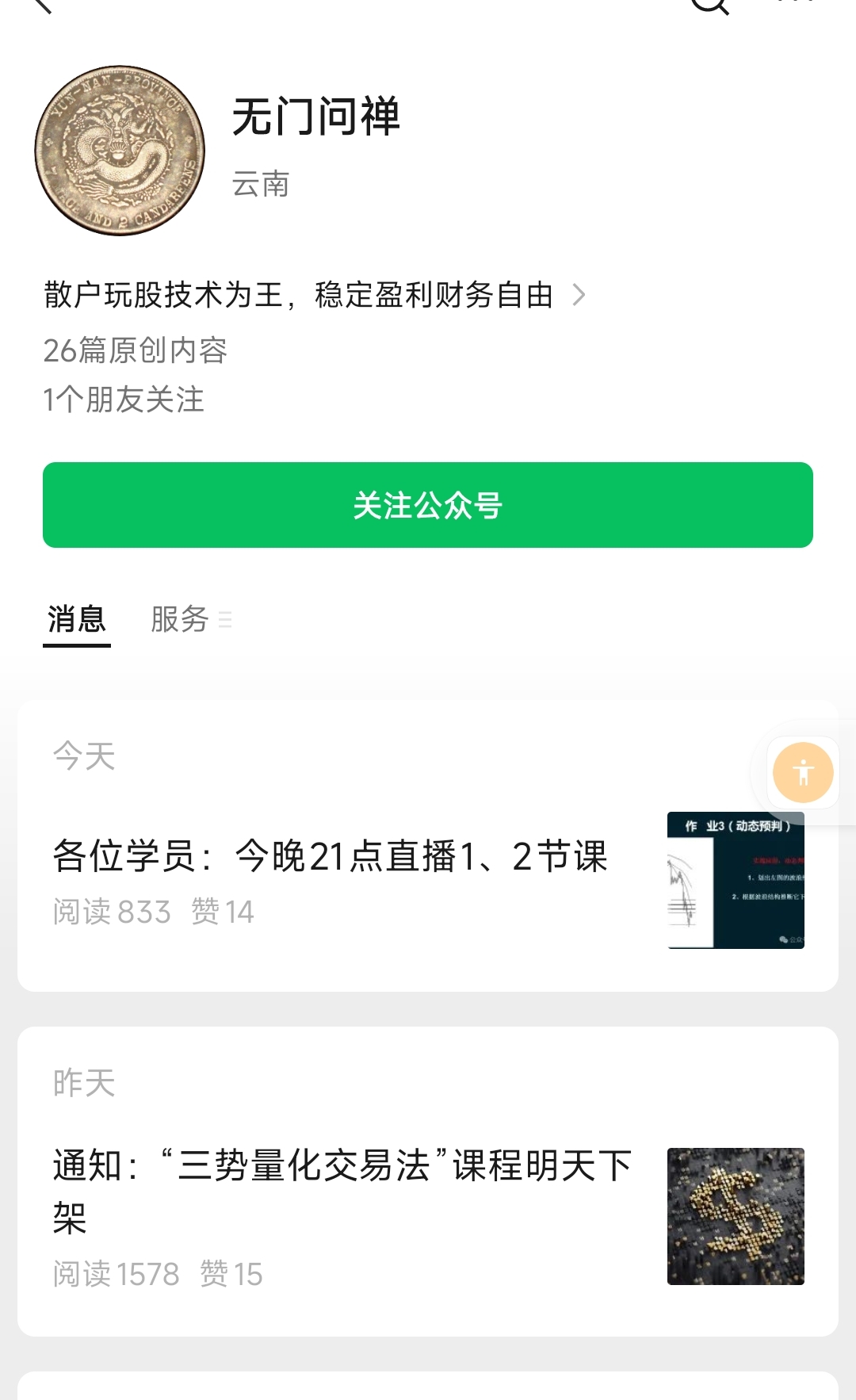 【实时同步】无门问缠 公众号大V 自行了解 实时消息24小时同步转发 直播圈子专享