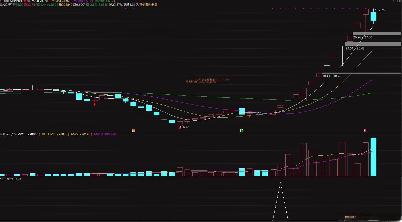- 全新思路的超短线操作实战模式指标,本指标是一款以低吸判断最近洗盘结束后 ,捕捉强势龙头信号介入点提示,自动过滤近期市场弱势股与不活跃股;成熟实战的思路策略设计,快速提升选股能力;
