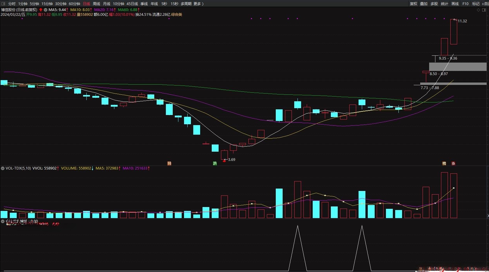 - 指标特点: 出票少而精!市场热点连板龙头股均有捕获!贴近实战,一直以来是我们研究指标技术的基础,本指标同样采用强势趋势加速新思路编写,旨在寻求强势个股的转折反弹点,强势股在短暂整理后,会产生强烈的再次拉升意愿,指标以高效快速筛选支撑较强的个股信号并大幅提高信号实战胜率;