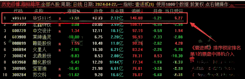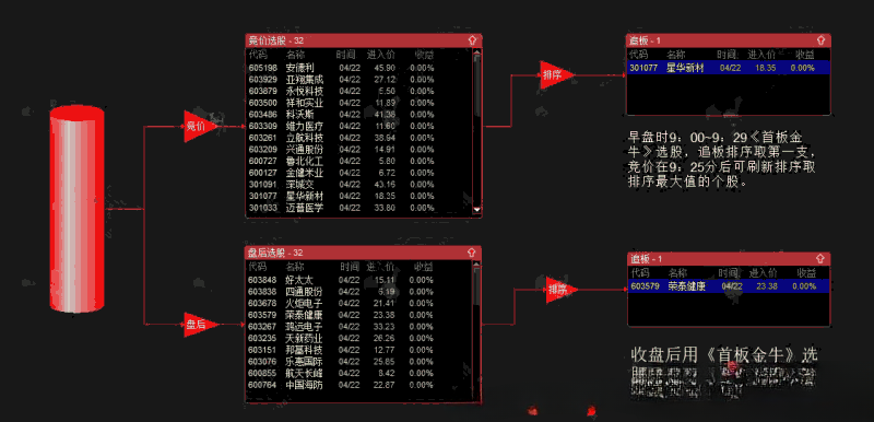 - 竞价排序初选强势票进行首单排序也是选排名第1,通过测试数据显现,指标成功率高,排序排名第一的优点是受益幅度大。指标包括主、副、选、排序指标共6个无加密指标。排序跟选股是需要搭配使用,早盘竞价时间使用,信号仅供参考,由于《首板金牛》需要选股跟排序搭配使用才能在竞价时间只选出1只,所以只能电脑通达信使用,手机无法两者搭配使用,仅供参考!当然你也可以用电脑直接《壹进贰》排序锁定排名第1的票盘中择机介入,这也是个不错的选择。