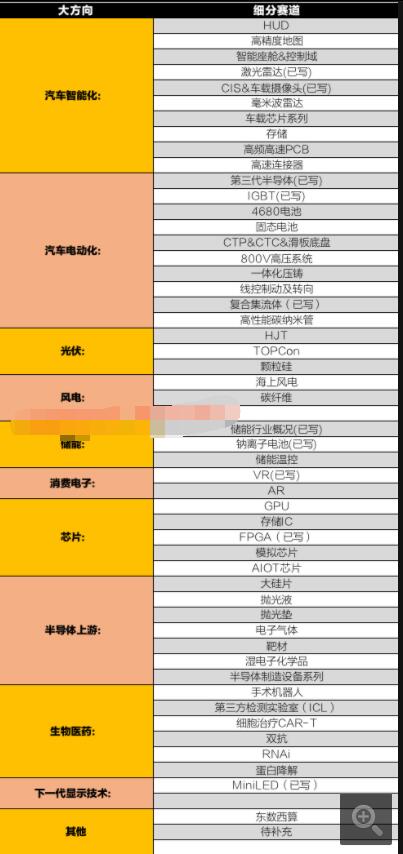 优先以生物医药、高端制造、芯片半导体、新能源、汽车(电动化+智能化)等为主,内含智能座舱、激光雷达、IGBT、SiC、800V高压系统、钠离子电池、固态电池、HJT、碳纤维、AIOT、CAT-T、手术机器人等四十多个细分赛道。