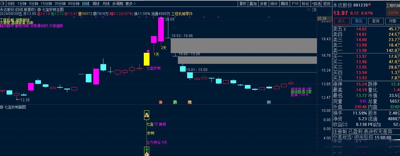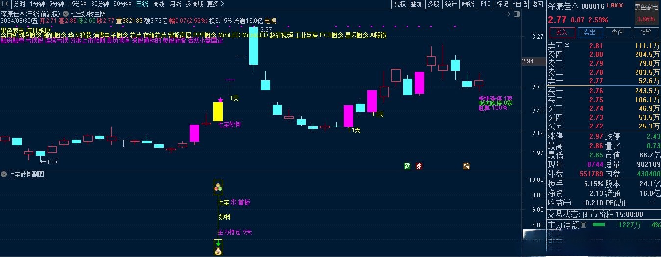 《2024七宝妙树 指标》简介:属于一款自动识别主力短期持仓天数 扑捉主力加速推高股价快速脱离成本启动信号 根据当天市场环境 大盘因素 板块因素依据一套概率学运算 自动判断当前出手胜算率 与 热点 风险主图中时时显示。