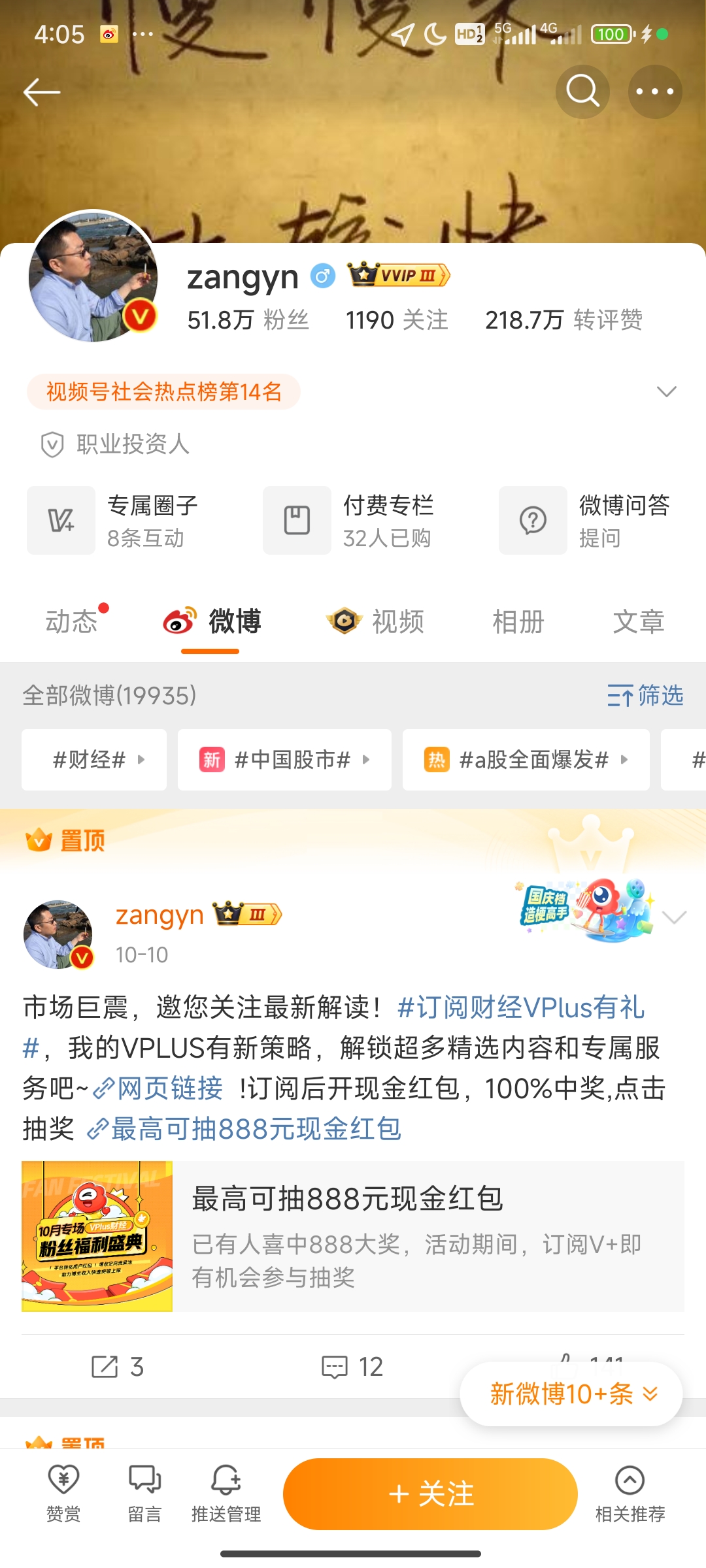 zangyn微博大V-人称/神,创造组合一年48倍人气大V,擅长技术面基本面心理面分析,善于捕捉市场良机,实战能力强。