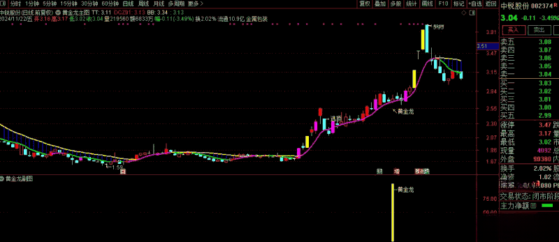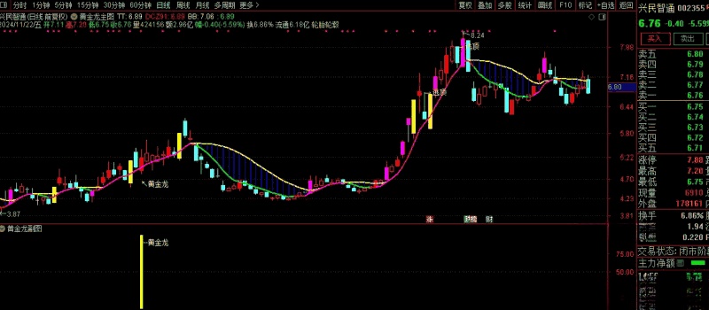 通达信【黄金龙】套装,正是这样一款集主图、副图与选股功能于一体的利器,无论是手机还是电脑,都能轻松驾驭,让您的投资之路更加便捷。该套装无未来函数,确保了信号的真实性与可靠性,让您在交易中更加安心。主图设计巧妙,二线合一的转折信号清晰明了,一旦趋势发生转变,立即提示黄金龙信号,为您捕捉最佳买卖时机。此外,主图还融入了逃顶信号,让您在股价见顶时能够及时撤离,避免损失。结合信号提示进行买卖操作,无论是短线还是中线,都能为您提供有力的参考。