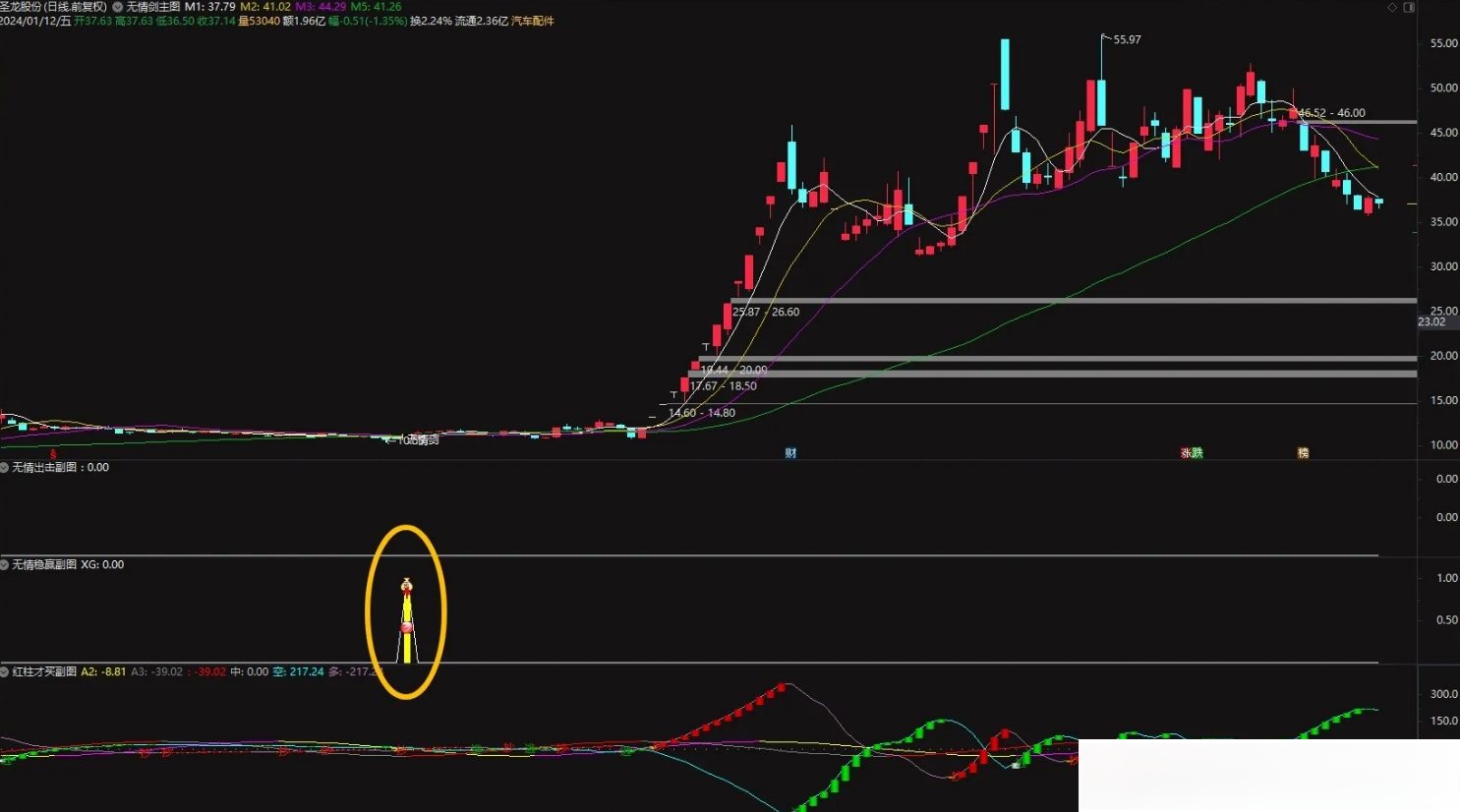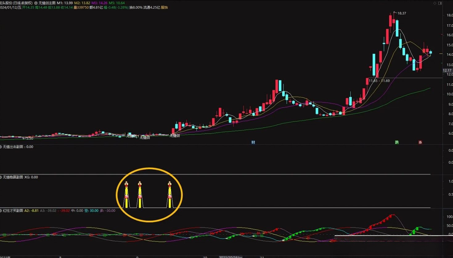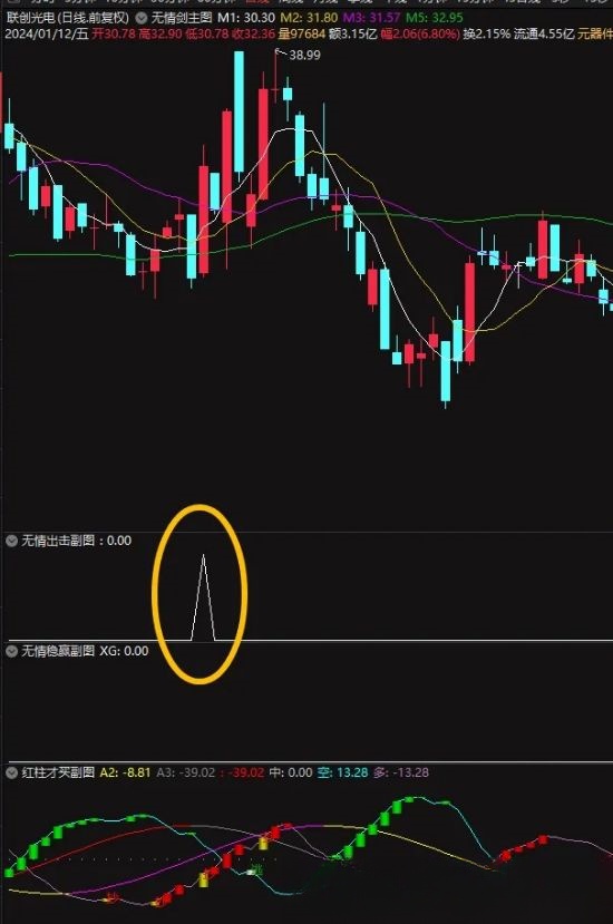 无情出击副图指标中我们用到了动态数据,内外盘函数,所以当天信号用预警选就不一定有,昨天和以前的信号票均可以在副图中查看到信号。