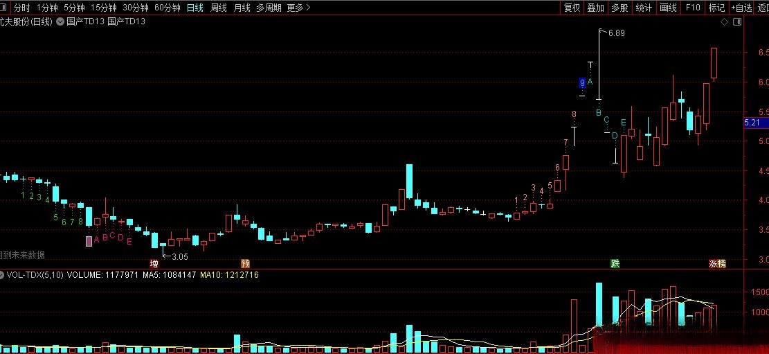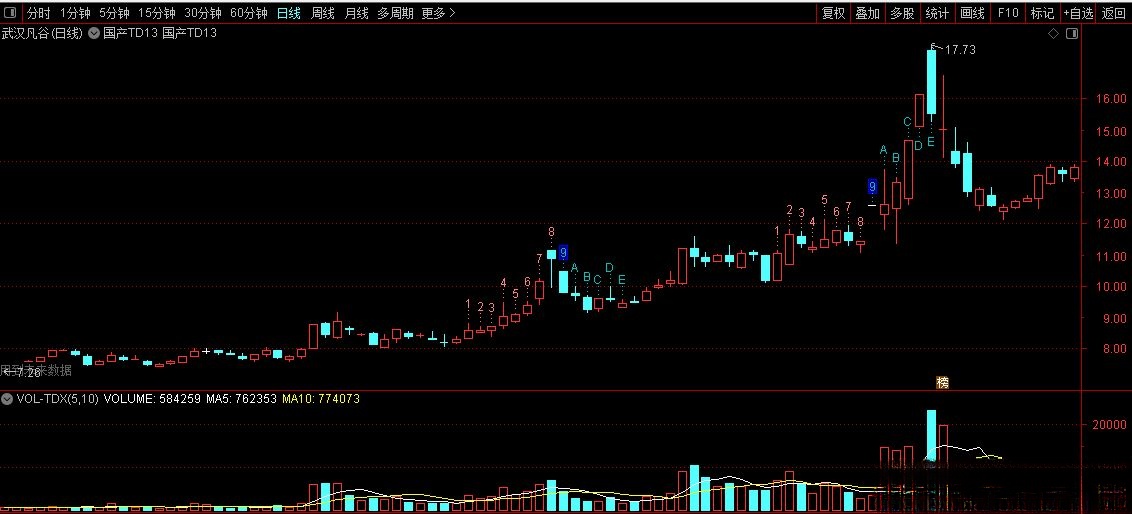 当我拿到TD9转13的公式后,在国内股市使用,它不灵了?你会发现很多票是一直大于4天前的收盘价,连续一直到13就拐头。那怎么办呢?我们将计就计。直接按他们错的来,在9之后我在公式中编辑ABCDE 这样,D就是13,但为什么会有E就是14呢?我还是认为这些操盘的数不明白,我怕他们错数,我加了个E。结果神奇的13转公式诞生了。我来复述一下用法: