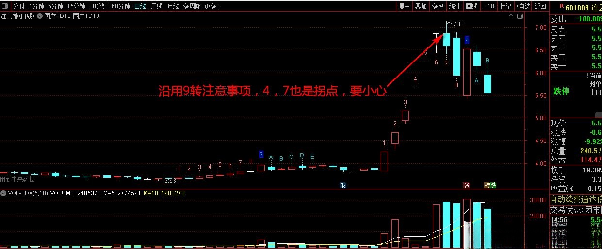 在9转序列里,4和7,通常有的股票就直接是拐点,4是小拐,而7可能是彻底改变了趋势,这个原来9转用法我强调一下,4拐,7拐沿用。需要注意:
