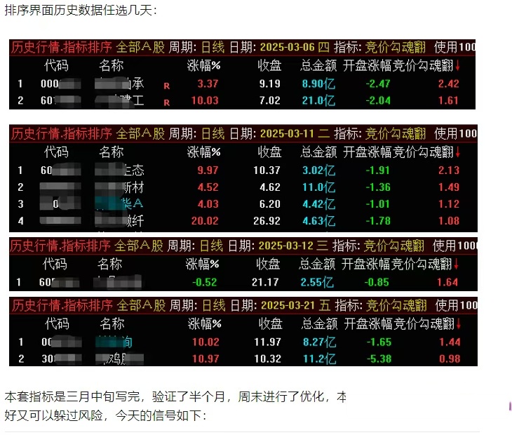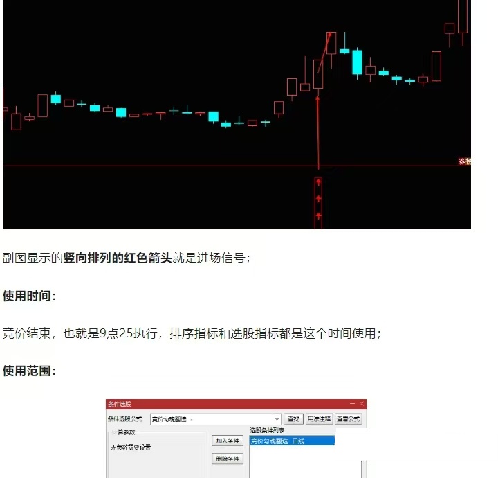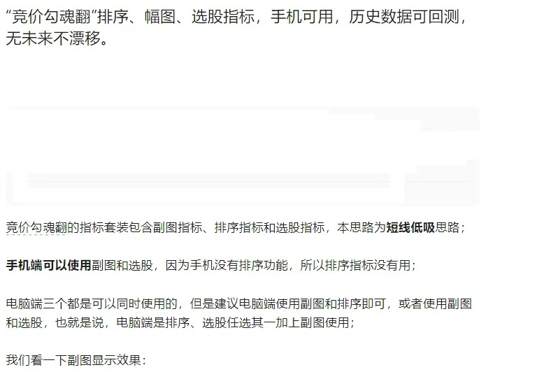 竞价勾魂幡套装指标包含1个副图、1个排序和1个选股指标。本思路为短线低吸思路;手机端可以使用副图和选股,电脑端是排序、选股任选其一加上副图使用;