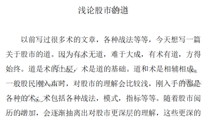 以前写过很多术的文章,各种战法等等,今天想写一篇关于股市的道。因为有术无道,难于大成,有术有道,方得始终。道是术的上层,术是道的基础。道和术是相辅相成,一般股民刚入市时,对股市的理解会比较浅,刚入手的都是各种的术;术包括各种战法,模式,指标等等。随着股市阅历的增加,会逐渐抽离出对股市更深层的理解,这些更深的理解再经过岁月的沉淀,就形成了一些体系,这些体系就构成了每个人的“道”。每人的“道”一定是有所差异的,因为和他的股市经历和股市感悟有关,和术一样,道也会分很多层次,每人所理解的道是在不同的层次上,但如果能一直发展的话,最后的汇念点会是一样的,万法归一,那就是最后的道。