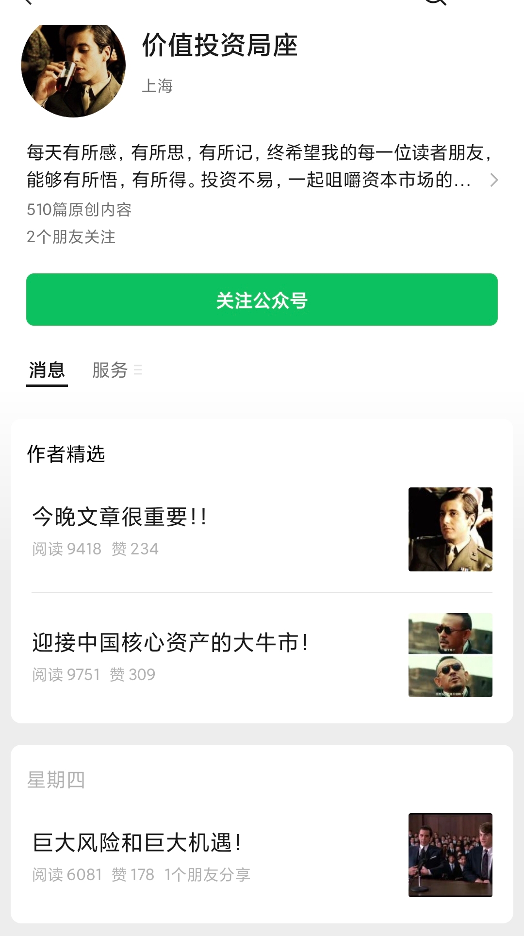 【实时同步】价值投资局座 公众号大v 跟先知研报差不多类型 自行了解 实时消息24小时同步转发 实盘圈子专享