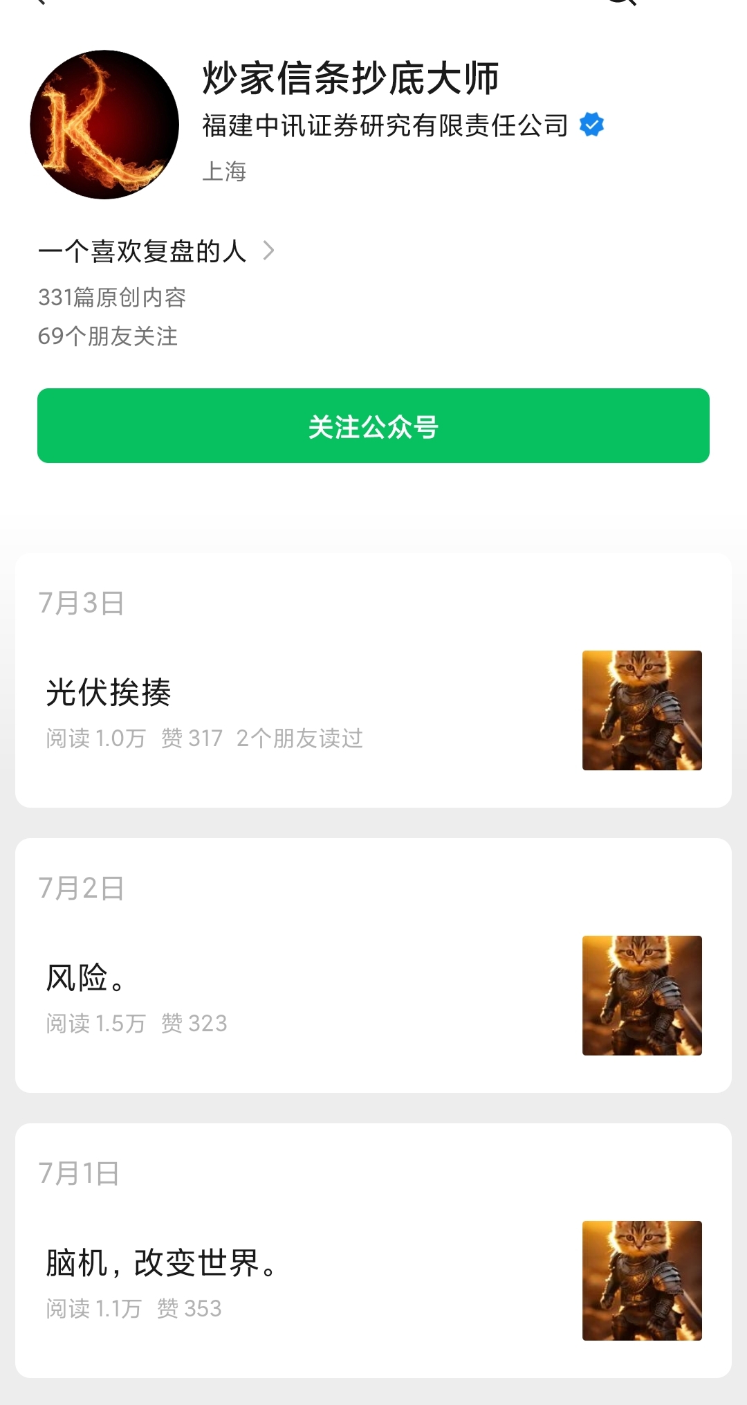 公众号大V-炒家信条抄底大师,6月份半个月盈利40个点,情绪流大师。