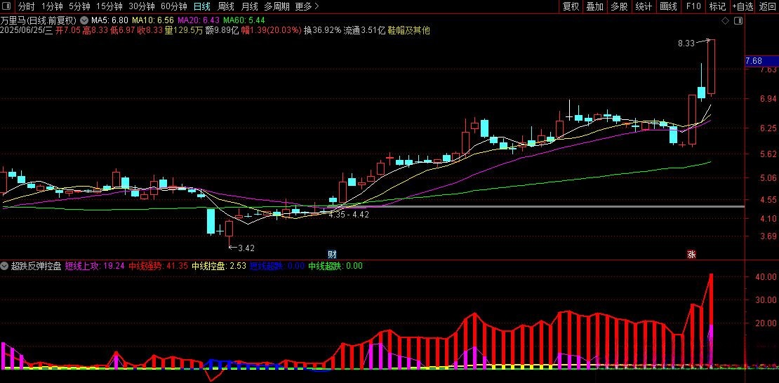 本策略通过多维度量化模型分析股票强弱状态,精准锁定超跌反弹与主力控盘两大核心机会。尤其在震荡市波段操作场景中,当短线超跌指标(蓝柱)与中线控盘信号(黄柱)形成共振时,往往预示着高质量反弹行情的启动。通过叠加中线强势指标(红柱)监测,可高效筛选具备持续领涨潜力的优质标的,实现跨周期品种配置。