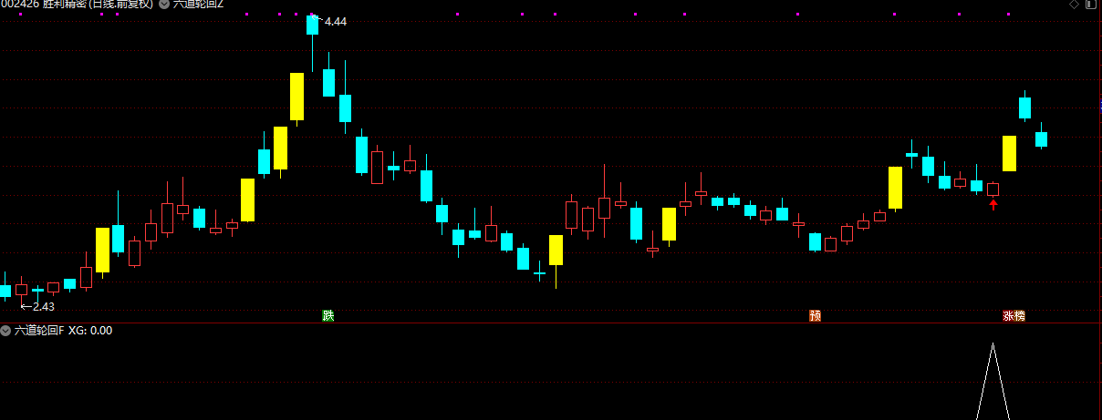 主图的红色实体k线是涨停板,红色向上的箭头是进场信号;
