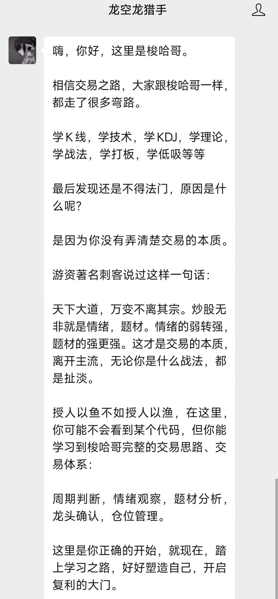 授人以鱼不如授人以渔,在这里,你可能不会看到某个代码,但你能学习到梭哈哥完整的交易思路、交易体系: