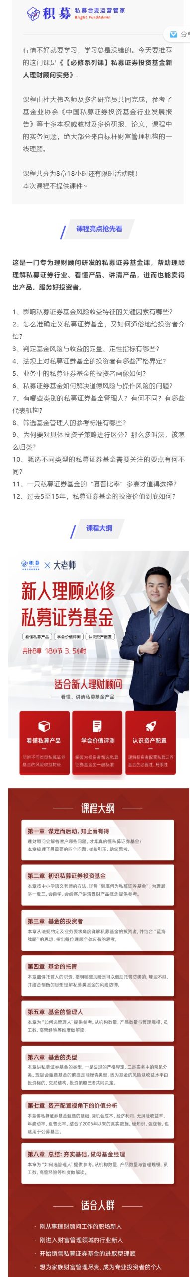 这是一门专为理财顾问研发的私募证券基金课,帮助理顾理解私募证券行业、看懂产品、讲清产品,进而也能卖得出产品、服务好投资者。