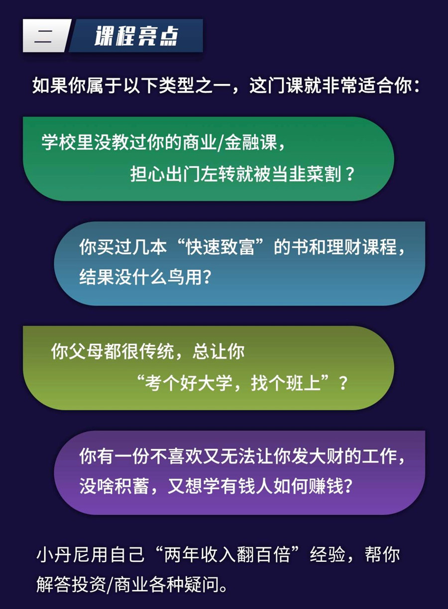 小丹尼用自己“工作越少、收入越多”亲身经历,从商业/金融的硬核知识开始,精选了6大行业、20家国内外公司、百场大佬演讲、千本商业/投资书籍,为你总结了20个原则、80个模型和120条经验,带你彻底看懂商业/金融的底层逻辑,拒绝被割,走向财务自由之路!