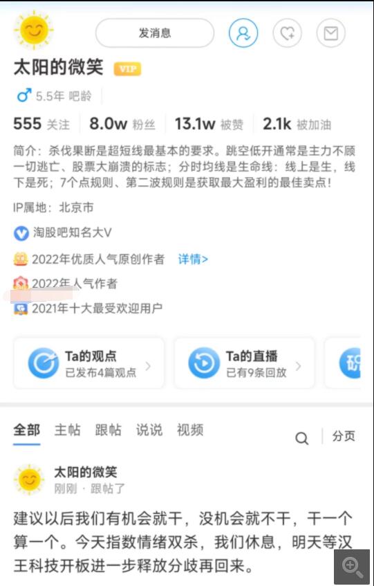 操作风格:淘股吧人气大V,每天复盘+次日预判+盘中观点直播,稳稳复利